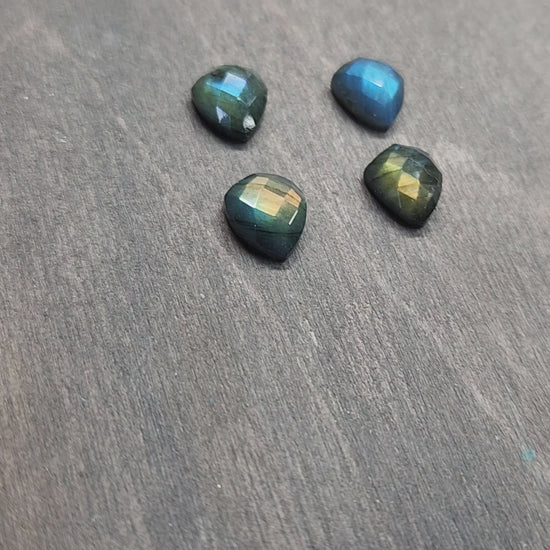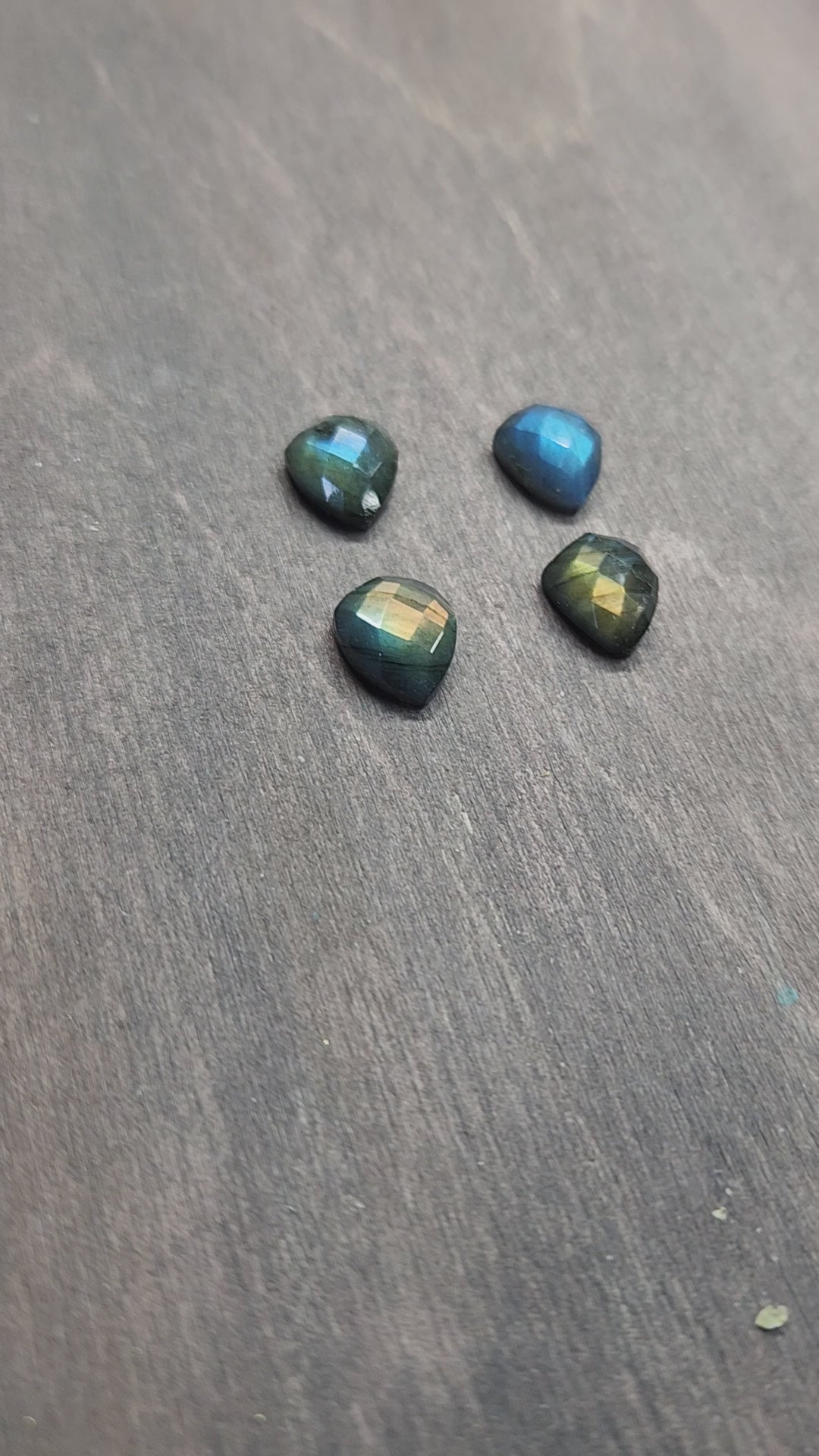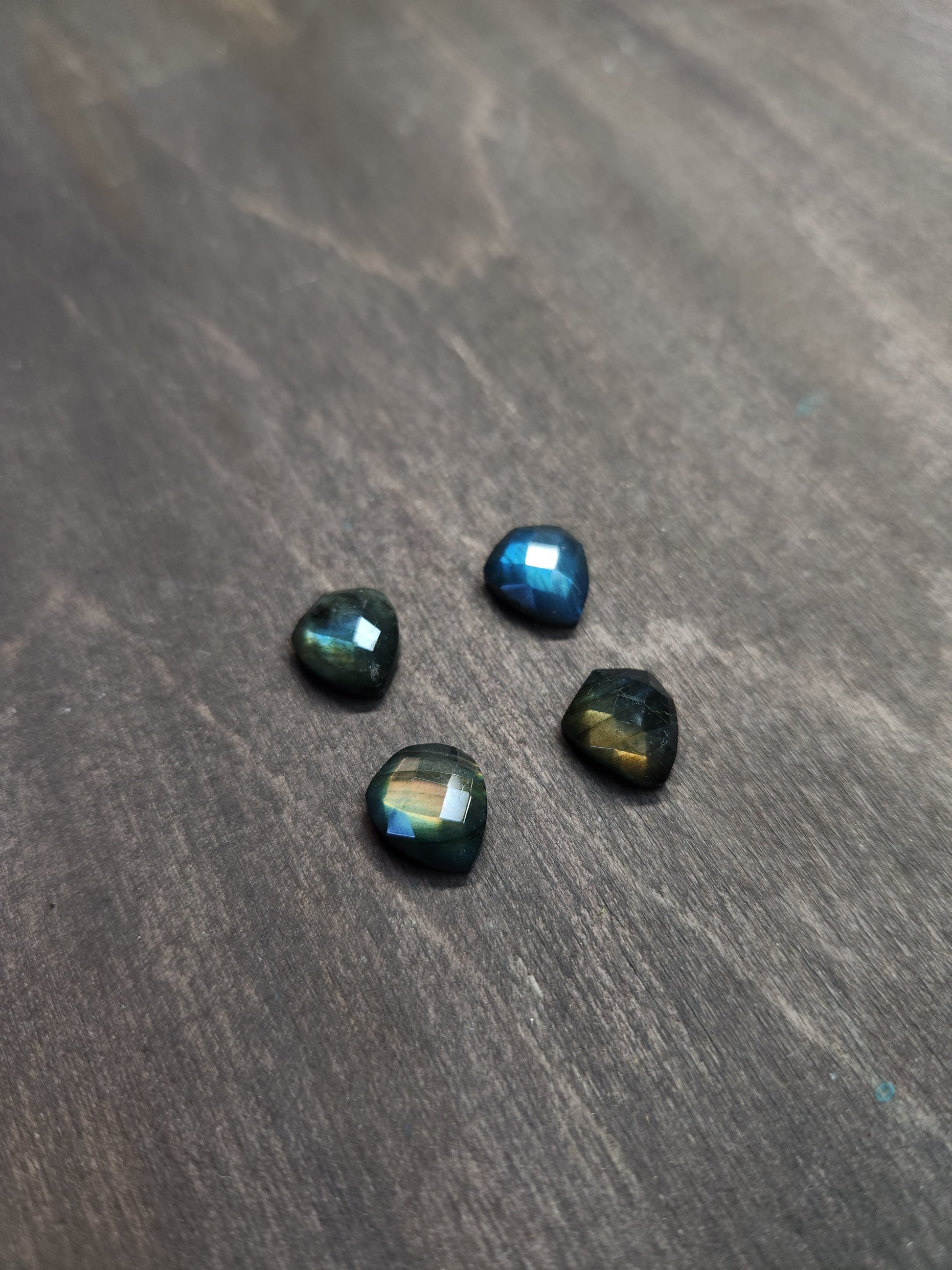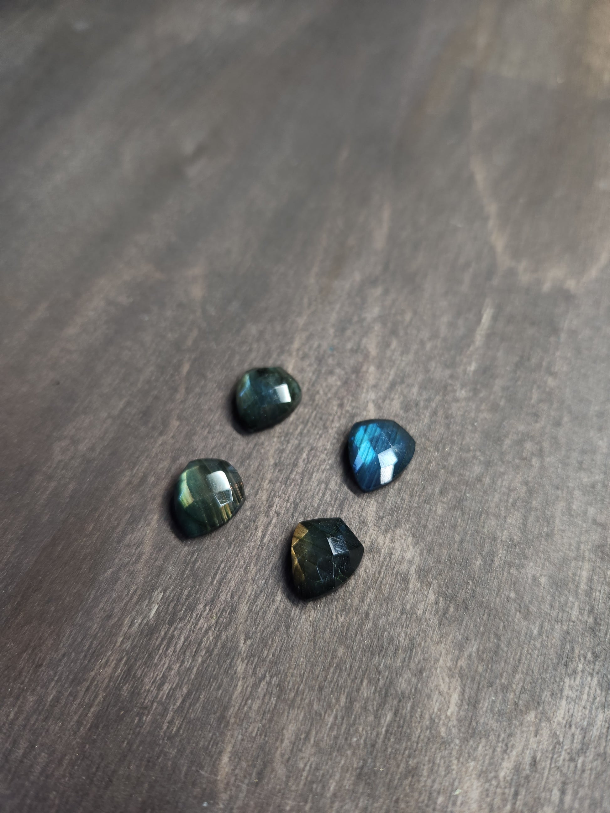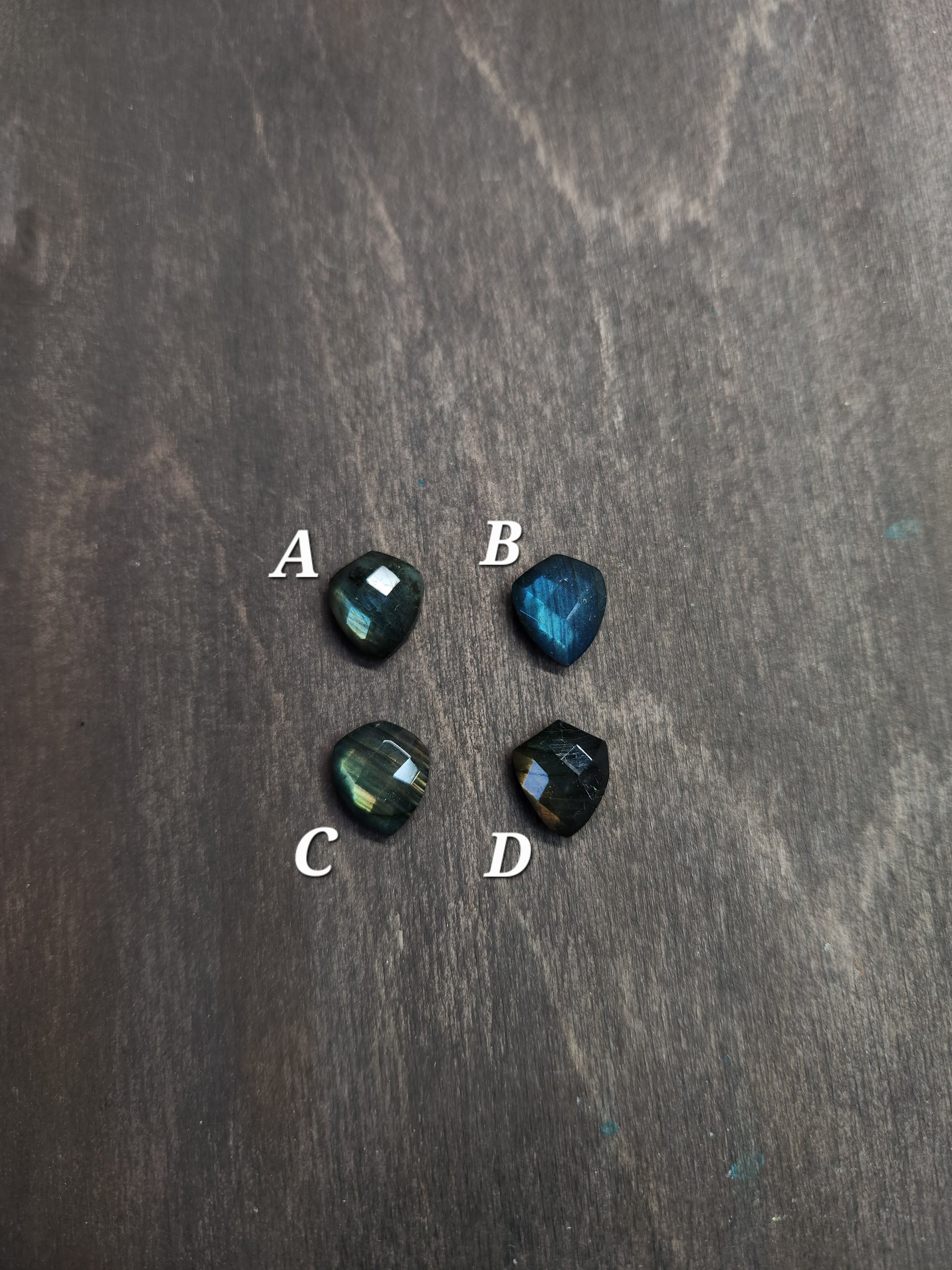 This ring is entirely hand fabricated from Brass sheet & wire stock. A simplified stackable design featuring a rope style band, a prong setting and small granule details. Fitted with your choice of a beautiful, faceted shield shaped Labradorite stone- please see the last photos for reference.