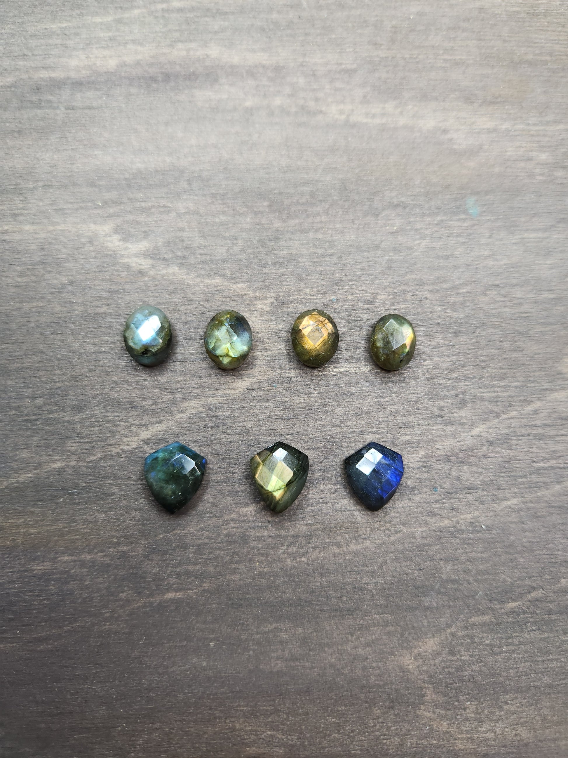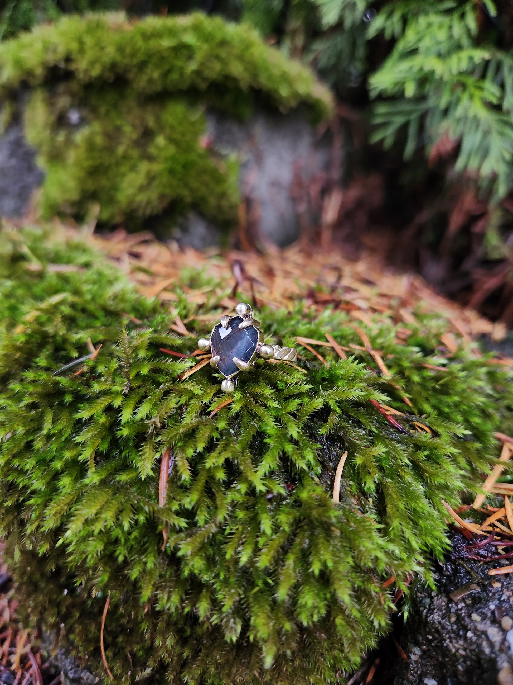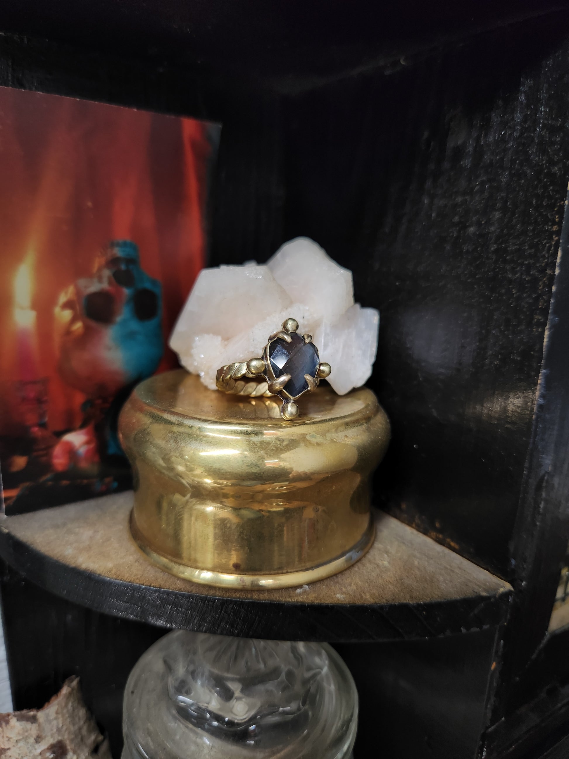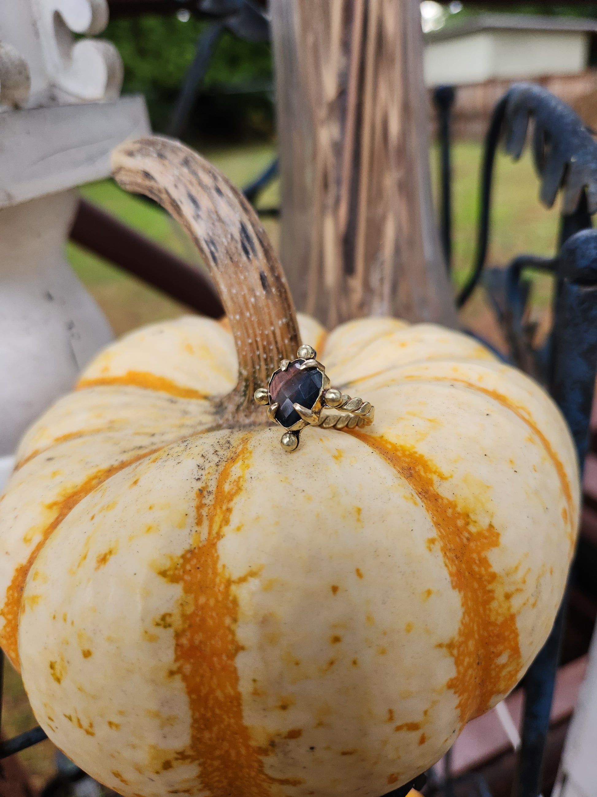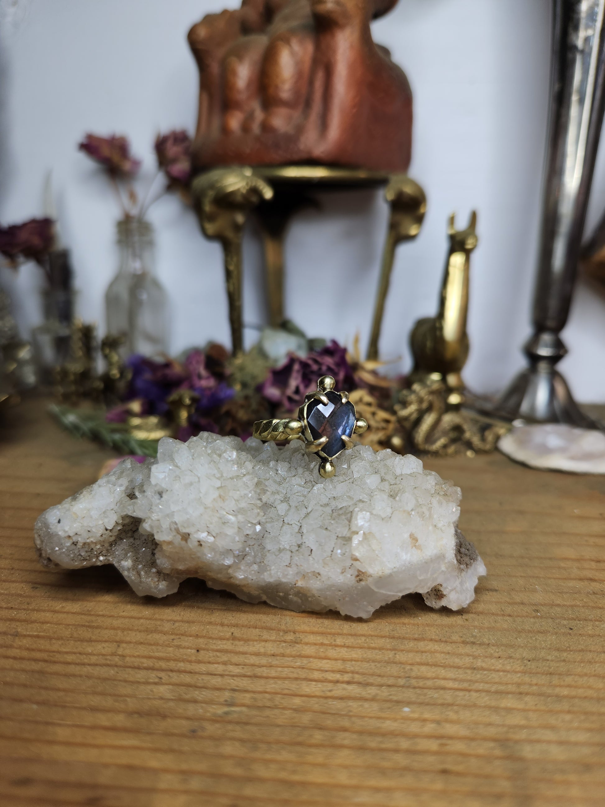 This ring is entirely hand fabricated from Brass sheet & wire stock. A simplified stackable design featuring a rope style band, a prong setting and small granule details. Fitted with your choice of a beautiful faceted Labradorite stone or an Amethyst, please see the last photos for reference.