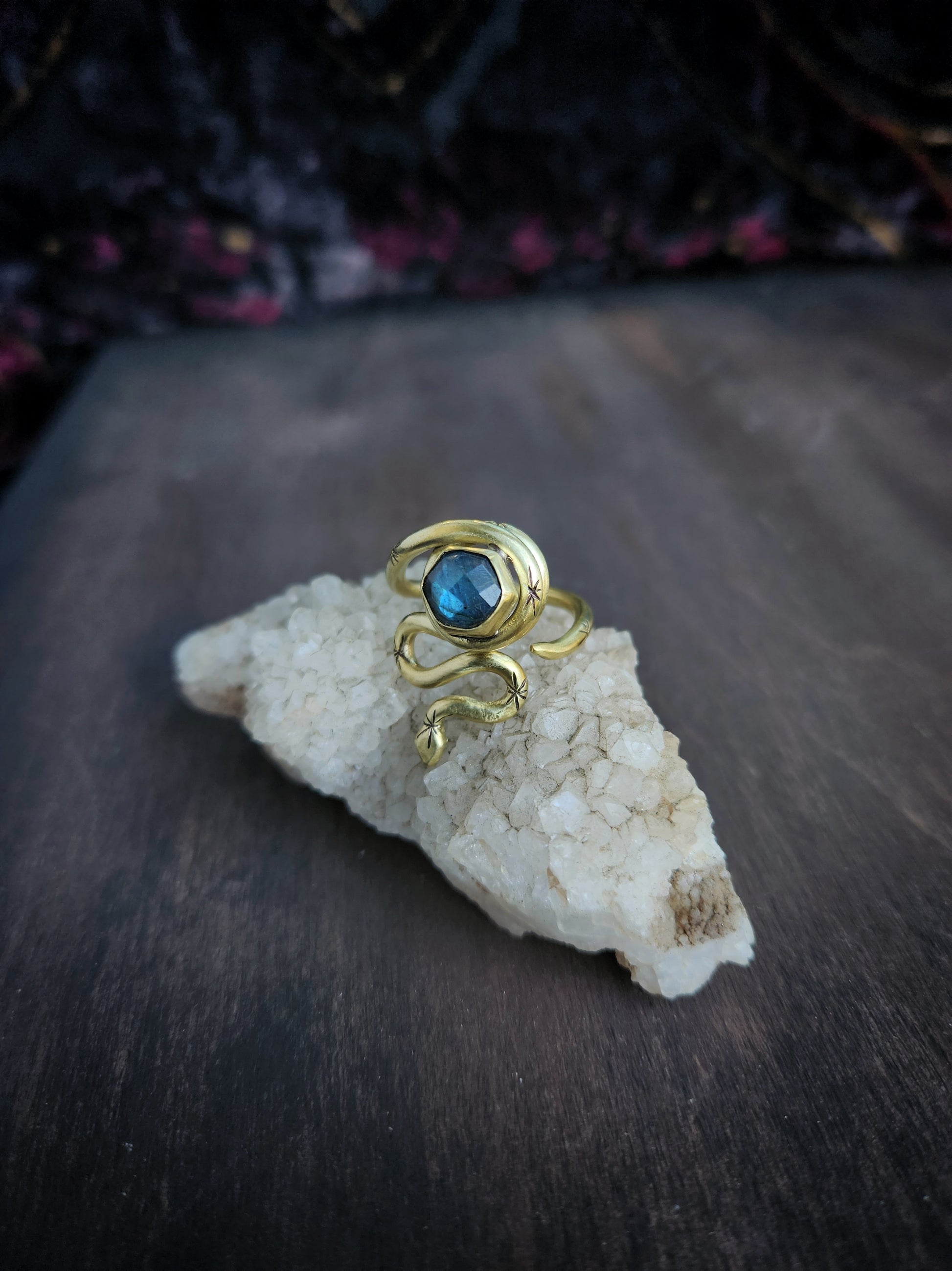 A star etched serpent coiled around a single faceted Labradorite stone. Each piece has been entirely hand fabricated from Brass sheet & wire stock. Finished with an antiqued patina & light polish for an heirloom aesthetic.