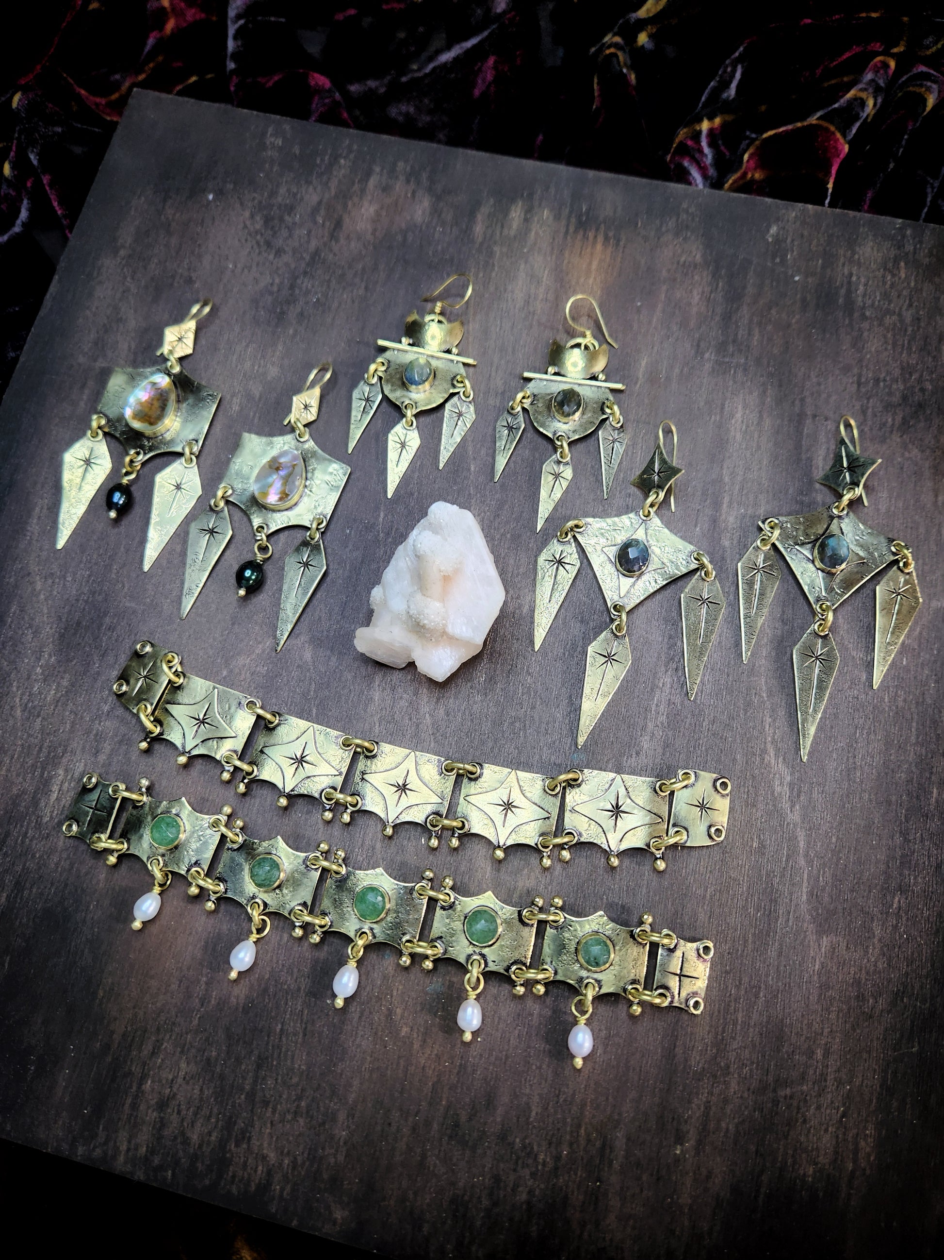 The Starfall earrings are entirely hand fabricated from Brass sheet & wire stock. Featuring a single Abalone shell at the focal of each earring, joined by falling star charms and a single dark green freshwater Pearl. Finished with an antiqued patina & light polish for an heirloom aesthetic.